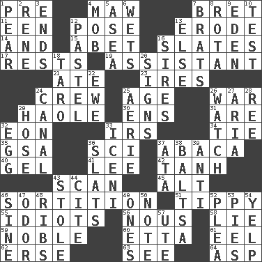 ACROSS 1. Before (prefix) 4. Opening into something insatiable 7. Cy Young winner Saberhagen 11. Car or cant ending 12. Airs 13. Wear away 14. Plus 15. Collude with 16. Chalkboards 17. Musical pauses 19. Helper 21. Had dinner 23. Angers 24. Ship's personnel 25. Ripen 26. Armed conflict 29. White Person, in Hawaii 30. Followers of ems 31. "We ___ not amused" (Victoria) 32. A really long time 33. Big collection agency 34. Make a knot 35. Girls' org. (abbr.) 36. _-fi 37. Phillipine bananalike plant 40. Set 41. Area sheltered from the wind 42. Hyperbolic tangent 43. Examine hastily 45. The first octave above the treble staff 46. Making a chance decision by using lots 51. Likely to tip or tilt 55. Foolish or stupid persons 56. Common sense 58. Whopper 59. Having high moral qualities 60. Singer James 61. Snakelike fish 62. Celtic language 63. Observe 64. Viper DOWN 1. Lightbulb-shaped fruit 2. French philosopher Descartes 3. Conclusions 4. Disorderly crowd 5. At sea 6. Moistens 7. Naughty children 8. Roll call or roster of names 9. Genesis locale 10. Trial 12. Soft color 13. Otherwise 16. Founders of families 18. Edible starchy tuberous root 20. Public displays of written messages 22. She-sheep 24. Lessep's creation 25. Nest on high 26. Timepiece 27. Roberta Peters solo 28. To sift 29. Flexible conduit 32. Ovum 33. Ancient Celtic tribe of eastern Britain 36. Narrow boards 37. _ moment's notice (2 wds.) 38. Greek mezzo-soprano Agnes 39. Against 43. Took without asking 44. Quote 46. Trig term 47. Scent 48. Chest bones 49. Singles 50. Brief written record 52. Entreaty 53. Sliced desserts 54. Sharp bark 57. Shoshoni