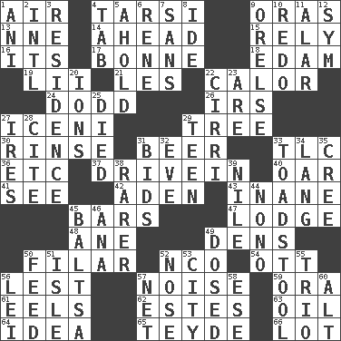 ACROSS 1. Wind 4. Tarsus (plural) 9. Mouths or openings 13. Compass dir. 14. Toward the future 15. Trust 16. ___ a Wonderful Life 17. Maid-servant 18. Dutch treat 19. Cards in a Roman deck? 21. French article 22. Bodily heat indicating an inflammation 24. Texas town _ City 26. Big collection agency 27. Ancient Celtic tribe of eastern Britain 29. Relationship diagram 30. Remove soap 31. Fermented drink made from hops 33. Affectionate concern, for short 36. And so on (abbr.) 37. Popular '50s hangout 40. Boat paddle 41. Observe 42. Arabian gulf 43. Empty; void 45. Soap units 47. Cabin 48. One (Scot) 49. Habitations of wild animals 50. Of or pertaining to a thread or threads 52. Non-commissioned officer (abbr.) 54. Baseball player Mel 56. For fear that 57. Annoying sound 59. Mouth or opening 61. Snakelike fish 62. _____ Park, CO 63. Lubricate 64. It may be bright or harebrained 65. Miss Universe 1986, Barbara Palacios _ 66. Car dealer's back yard DOWN 1. Black tropical American cuckoo 2. International (abbr.) 3. Dwelling 4. Bar bill 5. Hold, grip (Informal) 6. French philosopher Descartes 7. Without 8. Binary compound 9. Threatening words 10. Redecorate 11. Having or resembling wings 12. Symbol (abbr.) 20. Charged atoms 22. High-altitude cloud 23. "We ___ not amused" (Victoria) 25. Passed on 27. Angers 28. Quote 29. Adolescent 31. Auction offers 32. Night before a holiday 33. Inedible or poisonous agaric 34. Austrian-born American filmmaker Fritz 35. Algonquian 38. Less widely known 39. The longest river in the world 44. Words to Nanette 45. Greek mezzo-soprano Agnes 46. Santa ___, CA 49. Administered medicine 50. Nourish 51. Small island 52. Characteristic smell of wine 53. Municipality 55. Musical group of three 56. Flowery wreath 57. Fish or hair follower 58. Compass dir. 60. Keyboard modifier key