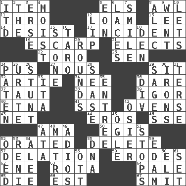 ACROSS 1. A whole individual unit 5. Raised railways 8. Leather borer 11. Through, poetically 12. Rich soil 13. Area sheltered from the wind 14. Cease 17. Event 19. Fortification 21. Chooses 22. "Corrida" creature 23. Elected rep. 24. Fluid product of inflammation 27. Good sense 29. Be seated 32. Nick name for Arthur 34. Born 36. Have the gumption 37. Pulled tight 38. One of the 12 tribes of Israel 39. Russian composer Stravinsky 40. Inactive volcano in Sicily 41. Fast jet (abbr.) 42. Baking chambers 43. Remaining after all deductions 44. Greek god of love 46. Compass dir. 47. Nursemaid (var.) 50. The front part of a cuirass 52. Declaimed 55. Keyboard key 57. Accusation by an informer 59. Eats (away) 62. Compass dir. 63. Round or rotation of duties 64. Light colored 65. Expire 66. Eastern Standard Time (abbr.) 67. Stricken, poetically DOWN 1. It would 2. Definite Article 3. Celtic language 4. Wet 5. Period of immesurable duration 6. Shoestrings 7. Grin 8. Actor Baldwin 9. Left 10. Allows 12. Mouth edge 15. Biscuitlike quick bread 16. Edible starchy tuberous root 18. Lair 20. Periods in a boxing match 24. Eucharist need 25. A salt of uric acid 26. Check the growth or development of 28. Gospel singer Marvin 29. Gurus 30. Metal shackles 31. Laconic 33. Call ___ day 35. Main course 36. HTML Container Element 42. Flexible twig of a willow tree 45. Stare at amorously 47. "One Day ___ Time" 48. Distance measurement (Brit.) 49. Goodbye (Sp.) 51. Halts 52. Wrote a lyric poem 53. Painter Guido (1575-1642) 54. Toward shelter 55. Heredity factor (abbr.) 56. Dutch treat 58. Baseball player Mel 60. Connecticut Ivy Leaguer 61. Put into a specified state