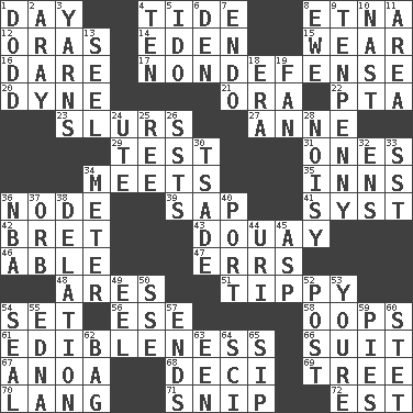 ACROSS 1. 24 hours 4. Event that recurs at intervals 8. Inactive volcano in Sicily 12. Mouths or openings 14. Genesis locale 15. Put on (as clothing) 16. Have the gumption 17. Unrelated to defense, as in spending 20. Centimeter-gram-second unit of force 21. Mouth or opening 22. Parent Teacher Assoc. 23. Plays smoothly or legato 27. Queen of England 1702-14 29. Trial 31. Washington bills 34. Confronts 35. Restaurants 36. Connecting point 39. Plant excrement 41. System (abbr.) 42. Cy Young winner Saberhagen 43. A city in N France, SE of Calais 46. Competent 47. Blunders 48. Ancient Greek god of war 51. Likely to tip or tilt 54. Put into a specified state 56. Compass dir. 58. I made a mistake 61. The property of being fit to eat 66. Set or collection 67. Small Philippine buffalo 68. Tenth: prefix 69. Woody plant 70. Long (Scottish) 71. Sever or remove by pinching or nipping 72. Eastern Standard Time (abbr.) DOWN 1. Texas town _ City 2. Like ___ of sunshine 3. Entertaining tales 4. "___ Little Indians" 5. Wedding promise 6. Lair 7. Inside; within (prefix) 8. She-sheep 9. 3-inch nail 10. Political cartoonist Thomas 11. Type of rug 13. Stitch closed the eyes of (a falcon) 18. Epoch 19. Air blower 24. Shoshoni 25. To sift 26. Fast planes 28. Annoyingly loud 30. Sadhe (variant) 32. Followers of ems 33. Fast jet (abbr.) 34. Distance measurement 36. Basketball assoc. 37. Globe 38. Conveyance 40. Left side of a ship or aircraft 44. RI univ. 45. Cleo's killer 49. Snakelike fish 50. Compass dir. 52. Mail 53. You are 54. Lick closed 55. Pulitzer Prize-winning author Ferber 57. Conclusions 59. Sliced desserts 60. Proofreading order 62. Container for groceries 63. Car or cant ending 64. _-fi 65. Small drink