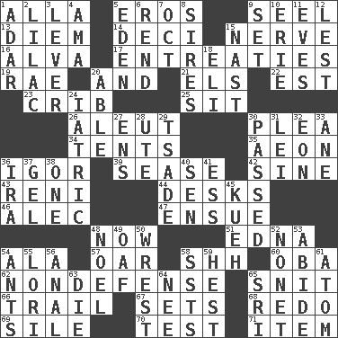 ACROSS 1. Silent film actress Nazimova 5. Greek god of love 9. Stitch closed the eyes of (a falcon) 13. South Vietnam president (1954) 14. Tenth: prefix 15. Boldness 16. Inventor's middle name 17. Pleas 19. Actress Charlotte 20. Plus 21. Raised railways 22. Eastern Standard Time (abbr.) 23. Baby bed with high sides 25. Be seated 26. Eskimo relative 30. Entreaty 34. Portable shelters 35. Period of immesurable duration 36. Russian composer Stravinsky 39. Gospel singer Marvin 42. Trig term 43. Painter Guido (1575-1642) 44. Writing tables 46. Actor Baldwin 47. Take place subsequently 48. At this time 51. Pulitzer Prize-winning author Ferber 54. Insect wing 57. Boat paddle 58. Quiet! 60. Chief or king in Benin or Nigeria 62. Unrelated to defense, as in spending 65. In a ____ (agitated or irritated) 66. Get behind 67. Puts into a specified state 68. Do over again 69. Filth; sediment 70. Trial 71. A distinct part DOWN 1. The sixth month of the Jewish calendar 2. Pale purple color 3. Crowbar 4. Wet nurse (var.) 5. Genesis locale 6. Tear apart 7. Sep. follower 8. Founders of families 9. Put into a specified state 10. One of the Great Lakes 11. Nights before holidays 12. For fear that 15. Political cartoonist Thomas 18. Biblical high priest 20. Competent 24. Of or pertaining to medicine 27. Followers of ems 28. Shoshoni 29. Sadhe (variant) 30. Went by 31. Luau accessory 32. A really long time 33. One (Scot) 36. Lyricist Gershwin 37. Set 38. Single 40. Elected rep. 41. Double-curved letter 45. Malaysian steamed pastry 48. Christmas carol 49. Clumsy lout 50. Take or capture by force 52. Music written for nine 53. Remain 54. Pismires 55. Australian parrot (variant) 56. Of or related to the anus 58. Fast planes 59. Command 61. Tiny particle 63. Pass on 64. Born 65. Indian title of respect (Mr.)