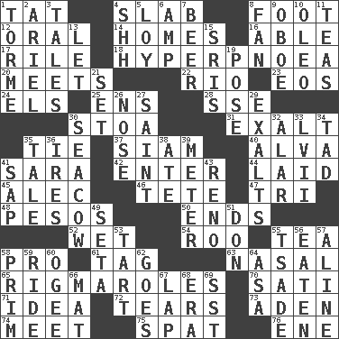 ACROSS 1. Make lace 4. Thick slice 8. 12 inches 12. Spoken 14. Residences 16. Competent 17. Cause heat under the collar 18. Abnormally rapid or deep breathing 20. Confronts 22. River (Sp.) 23. Greek goddess of the dawn 24. Raised railways 25. Followers of ems 28. Compass dir. 30. Portico 31. Honor 35. Standoff 37. Thailand, formerly 40. Inventor's middle name 41. "Two Mules for Sister ____" 42. Keyboard key 44. Put down 45. Actor Baldwin 46. Wig 47. Three (prefix) 48. Mexican monetary units 50. Extremities 52. Soggy 54. Friend of Pooh 55. Beverage made from leaves 58. Adept person 61. Label 63. Relating to the nose 65. Frustrating wastes of time 70. Suttee (variant) 71. The main thing one is thinking about 72. Lacerates 73. Arabian gulf 74. Rendezvous 75. Argument over a trivial matter 76. Compass dir. DOWN 1. Singer Mel 2. Satellite of Uranus 3. Falsehoods 4. Quiet! 5. Myrna of the movies 6. Electrical Unit 7. Fermented drink made from hops 8. Air blower 9. Mitch Miller's instrument 10. Margarine 11. Beverages made from leaves 13. Allow 15. Indian titles of respect 19. Airs 21. Arrange properly for use 26. Characteristic smell of wine 27. Virtuous person 29. Honors 30. Manatee 32. Having or resembling wings 33. 57 in ancient Rome 34. Small boy 35. Story 36. Angers 38. Had dinner 39. Distance measurement 41. Plant excrement 43. Former U.S. Attorney General Janet 49. Bristle 51. Spanish title 53. Small pie 55. Sadhe (variant) 56. Consumed 57. Place in a line 58. Demure 59. Travel on or in a vehicle 60. Double curve, resembling the letter S 62. Moves 64. White ___ sheet 66. Floor covering 67. Infant locale 68. Period 69. Fast jet (abbr.)