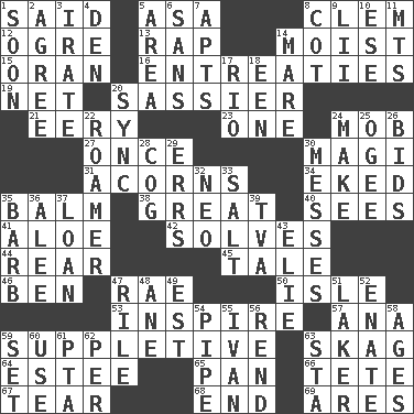 ACROSS 1. Expressed in words 5. White ___ sheet 8. Clement's nick name 12. Legendary monster 13. Strike 14. Damp 15. NW Algerian seaport 16. Pleas 19. Fish or hair follower 20. More impudent 21. Suggestive of the supernatural 23. Single 24. Crowd into 27. At one time in the past 30. Wise men 31. Oak nuts 34. Supplemented with great effort 35. Lip ointment 38. Relatively large 40. Observes 41. _ vera 42. Finds the solution 44. Located in or toward the back 45. Story 46. Benjamin's nick name 47. Actress Charlotte 50. Small island 53. Heighten or intensify 57. Santa ___, CA 59. Supplementary 63. Heroin 64. First name in cosmetics 65. Baking dish 66. Wig 67. Pull into pieces 68. Conclude 69. Ancient Greek god of war DOWN 1. Within a short period 2. Match 3. Feeling or showing extreme anger 4. Lair 5. Type of rug 6. Without 7. Tenement units (abbr.) 8. Small bed 9. Cards in a Roman deck? 10. Compass dir. 11. Mountains (abbr.) 14. Female horse 17. _ de Janeiro 18. Car or cant ending 20. Synchronize (abbr.) 22. Wanderer 24. Create 25. Double curve, resembling the letter S 26. Auction offers 28. Gear tooth 29. Blunders 30. Makes clutter 32. Modern: prefix 33. Table seasoning 35. Sharp remark 36. Toward shelter 37. Grant temporary use of 39. Federal power corp. 43. Writer Wiesel 47. Cause heat under the collar 48. One (Scot) 49. Eastern Standard Time (abbr.) 51. Member of a famous L.A. basketball team 52. Maternal 54. Corncob 55. _ the terrible 56. Tear apart 58. Matures 59. Arrange properly for use 60. Purpose 61. Parent Teacher Association (abbr.) 62. For each 63. R.R. building
