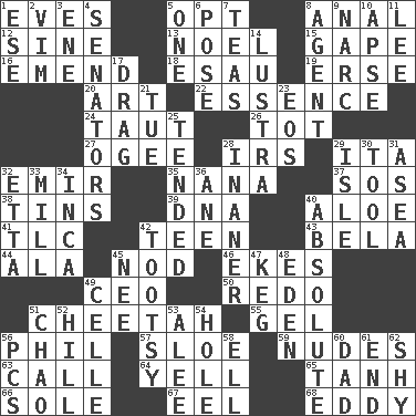 ACROSS 1. Nights before holidays 5. Elect 8. Of or related to the anus 12. Trig term 13. Christmas carol 15. Yawn 16. Make improvements or corrections to 18. He sold his birthright 19. Celtic language 20. Nonscientific branch of learning 22. Substance 24. Pulled tight 26. Small child 27. Double curve, resembling the letter S 28. Big collection agency 29. Call ___ day 32. Independent ruler or chieftain 35. Nanny 37. Mayday 38. Canisters 39. Heredity factor (abbr.) 40. _ vera 41. Affectionate concern, for short 42. Adolescent 43. Actor Lugosi 44. According to 45. Allow head to fall sleepily 46. Supplements with great effort 49. Corporate head (abbr.) 50. Do over again 51. Leopard's kin 55. Set 56. Silvers or Donahue 57. _ gin 59. Unadorned figures 63. Give a ring to 64. Shout 65. Hyperbolic tangent 66. Not divided or shared with others 67. Snakelike fish 68. Whirlpool DOWN 1. Compass dir. 2. Zeal 3. Compass dir. 4. Legislators 5. Single 6. Airs 7. Afternoon social gatherings 8. Representative 9. Drug cop 10. Domed church section 11. Area sheltered from the wind 14. A period of five years 17. To trail on the ground 21. Third day of the wk. 23. Greek goddess of the dawn 25. Watched over 28. More lacking in sense or substance 29. Capri or Wight 30. Instrument 31. At sea 32. Singer James 33. Place where flour is made 34. South American Indian 36. A saturated hydrocarbon 40. Utter; complete 42. A girl or young woman (variant) 45. Born 47. Cask 48. Paradise 49. Cell (Danish) 51. US Secretary of Labor Elaine L. _ 52. Land elevation 53. Toward shelter 54. Hollow 56. Personal Computers (abbr.) 58. Pipe bend 60. Male parent 61. Conclusion 62. Like a shrinking violet