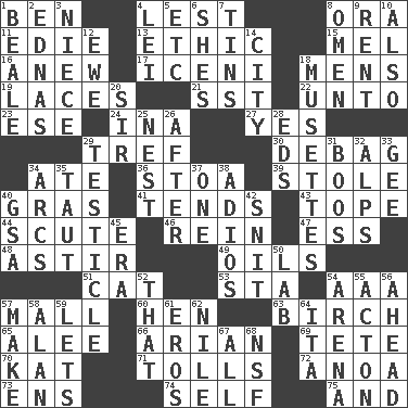 ACROSS 1. Benjamin's nick name 4. For fear that 8. Mouth or opening 11. Singer Brickell 13. Principle of right and wrong 15. Cartoonist voice _ Blanc 16. Afresh 17. Ancient Celtic tribe of eastern Britain 18. Not women's 19. Shoestrings 21. Fast jet (abbr.) 22. To (old English) 23. Compass dir. 24. _ tizzy (2 wds.) 27. Affirmative reply 29. Not kosher 30. Debunk (Brit. slang) 34. Had dinner 36. Portico 39. Took without asking 40. Pate de foie ____ 41. Watches over 43. Drink excessively 44. Scutum 46. It's straight from the horse's mouth 47. Double-curved letter 48. Moving about 49. Petroleums 51. Domesticated feline 53. R.R. building 54. Auto club (abbr.) 57. Promenade 60. Layer 63. A tree used for making furniture 65. Toward shelter 66. Believer in; advocate of (suffix) 69. Wig 70. Krazy ___ of comics 71. For Whom the Bell _____ 72. Small Philippine buffalo 73. Followers of ems 74. Automatic 75. Also DOWN 1. Memphis, Tenn. Street 2. Ferber et al. 3. Sibling's daughter 4. Flowery wreath 5. And so on (abbr.) 6. "______ My Girl" (Turtles hit) 7. Canisters 8. Sign of something about to happen 9. Monthly bill 10. In addition 12. She-sheep 14. Municipality 18. French bagpipes 20. Title for a knight 25. Egg locale 26. Following 28. Begley and Asner 29. A testis 31. Expressions of contempt or scorn 32. High mountains 33. Turn to the right 34. Arches 35. Tense 37. Single 38. Goodbye (Sp.) 40. Girls' org. (abbr.) 42. In a ____ (agitated or irritated) 45. Period 50. Experiment locale 52. Not this but _ 54. Sports stadium 55. 13-14th century defensive garment 56. Having the leading position 57. Create 58. Actor Alda or Thicke 59. Allows 61. Greek god of love 62. Mediterranean tributary 64. Call ___ day 67. 100% 68. Overdraft (abbr.)