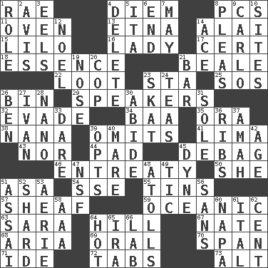 ACROSS 1. Actress Charlotte 4. South Vietnam president (1954) 8. Personal Computers (abbr.) 11. Baking chamber 13. Inactive volcano in Sicily 14. Jai _ 15. _ and Stitch 16. Kenny Rogers chart-topper in '80 17. Sure thing 18. Center 21. Calif. Air Force Base 22. Plunder 23. R.R. building 25. Distress signal 26. Storage container 29. Orators 32. Dodge 34. Sound made by sheep 35. Mouth or opening 38. Grandmother 39. Leaves out 41. Pale green bean 43. Not either 44. Groovy apt. 45. Debunk (Brit. slang) 46. Plea 50. A female animal or person 51. White ___ sheet 54. Compass dir. 55. Airtight sealed metal containers 57. To gather and bind into a bundle 59. Pertaining to the sea 63. "Two Mules for Sister ____" 64. Land elevation 67. Nathan's nickname 68. Operatic vocal solo 69. Taken by mouth 70. Connect, as a bridge 71. Binary compound 72. Bar bills 73. Keyboard modifier key DOWN 1. Hero or heavy, e.g. 2. Opinion 3. Snakelike fish 4. Erase 5. Call ___ day 6. Conclusion 7. Can I? 8. Entreaties 9. Monte _, Las Vegas Hotel/Casino 10. Settings 12. Christmas carol 14. Adept person 19. Characteristic smell of wine 20. Police officer (slang) 21. Drinking establishment 23. Three-handed card game 24. Afternoon social gatherings 26. Benjamin's nick name 27. _ the terrible 28. Billionth: prefix 30. Tolerate 31. Flatfish 33. Have the gumption 36. Teases 37. Nanny 39. Elects 40. Female horse 42. Mature 45. Unit of force 47. Science/research agcy. 48. Ringlike coral islands and reefs 49. Nervous spasm 51. Slender Brazilian palm 52. Pottery fragment 53. Nest on high 56. Without 58. American Automobile Association (abbr.) 60. California wine valley 61. Slanted text style (abbr.) 62. Penny 64. Being at a high temperature 65. Retirement account (abbr.) 66. Experiment locale