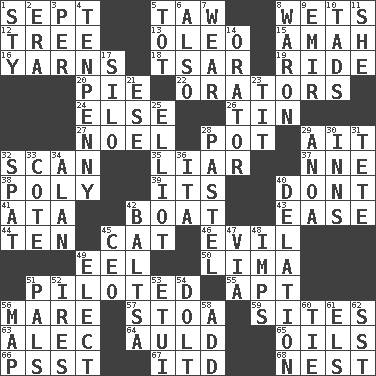 ACROSS 1. Back-to-school mo. 5. The 23rd letter of the Hebrew alphabet 8. Soaks 12. Woody plant 13. Butter sub 15. Nursemaid 16. Entertaining tales 18. Russian ruler of old 19. Travel on an animal 20. Sliced dessert 22. Speakers 24. Otherwise 26. Shallow baking pan 27. Christmas carol 28. Cooking vessel 29. Small island 32. Skim 35. One who doesn't tell the truth 37. Compass dir. 38. More than one (prefix) 39. It is 40. Do not 41. "One Day ___ Time" 42. Water vessel 43. Relaxation 44. "___ Little Indians" 45. Domesticated feline 46. Tending to cause great harm 49. Snakelike fish 50. Pale green bean 51. Manned the helm 55. Fitting 56. Female horse 57. Portico 59. Settings 63. Actor Baldwin 64. Old (Scot.) 65. Petroleums 66. Inconspicuous attention getter 67. It would 68. A home for chicks DOWN 1. Filthy place 2. Period 3. For each 4. 3-inch nail 5. Small child 6. In addition 7. Erode 8. Make _____ (do battle with) 9. Independent ruler or chieftain 10. Small boys 11. A female animal or person 14. Speaker 17. Grain storage tower 21. Compass dir. 23. Teat (slang) 25. American author Paul (1891-1958) 28. Soft color 29. Small Philippine buffalo 30. Restaurants 31. False hair 32. Argument over a trivial matter 33. ____ d'Azur (French Riviera) 34. Actor Alda or Thicke 36. Call ___ day 40. Conveyance 42. Greek mezzo-soprano Agnes 45. Corporate head (abbr.) 47. By way of 48. Naughty children 49. Opt 51. Friends 52. Angers 53. Needle case 54. Stupid person 56. Atlas unit 58. Find the sum of 60. Make a knot 61. Raised railways 62. Fast jet (abbr.)