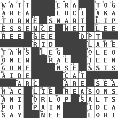 ACROSS 1. Electrical Unit 5. Epoch 8. Coat; cloak 11. Type of rug 12. Event scenes 14. Alias (abbr.) 15. Singer Mel 17. Don Adams' spy role 18. Mouth edge 19. Substance 21. Was introduced to 22. Area sheltered from the wind 23. Portuguese money of account (variant) 24. Turn to the right 25. Choose 27. To free from 28. Unable to walk 31. Scottish caps 35. Part of a journey 37. Margarine 38. Sign of things to come 39. Actress Charlotte 41. Adolescent 42. Went 43. Science/research agcy. 45. Fast planes 46. Assistant 47. Feline 49. Curve 51. "We ___ not amused" (Victoria) 52. Ocean 55. Big _ 57. Untruth 60. Thinks logically 62. Cuckoo 63. Lowest deck of a ship 65. Table seasonings 66. Cooking vessel 67. Ache 68. The main thing one is thinking about 69. Declare 70. Born 71. Australian parrot (variant) DOWN 1. Wetness 2. Came up 3. Laconic 4. Not wild 5. Shade tree 6. Wander aimlessly 7. Land measure 8. Baron Munchausen's specialties 9. Migrant worker of the '30s 10. Yawn 13. "Tell ____ the Marines!" 16. Engineer (abbr.) 17. Sowing specialist 20. To provide with a ceiling 26. Small pieces of grounds 29. Confront 30. Immeasurably long periods of time 31. Ancient Roman robe 32. Mine, in Marseilles 33. Ananias' fault 34. Contemptuous expression 36. Separate the seeds from cotton 40. Fortification 44. Conductor's collection 48. Afternoon social gatherings 50. Hoof sound 52. Twentieth part of a lira 53. Keyboard key 54. Slender Brazilian palm 55. Atlas contents 56. Small Philippine buffalo 58. SW Asia republic 59. Writer Wiesel 61. Travel by water 64. Single