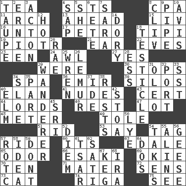 ACROSS 1. Afternoon social gathering 4. Fast planes 8. Tax preparer (abbr.) 11. Bowlike part 13. Forward in time 15. 54 in ancient Rome 16. To (old English) 17. Stone: prefix 18. Native american tent (variation) 19. Peter (Polish) 21. Hearing organ 22. Nights before holidays 23. Car or cant ending 24. Leather borer 27. Affirmative reply 29. Past tense of be (plural) 30. Halts 34. Health resort 36. Independent ruler or chieftain 39. Grain storage towers 40. Enthusiasm 41. Unadorned figures 43. Certainty 44. Domineers 46. Repose 47. Car dealer's back yard 48. Distance measurement 49. Lacquered or enameled metalware 51. To free from 53. Declare 54. Label 57. Travel on an animal 60. It is 63. Peak District village in England 65. Aroma 66. 1973 Nobel Price Winner (Physics) Leo 69. Migrant worker of the '30s 70. "___ Little Indians" 71. Mother 72. Elected reps. 73. Domesticated feline 74. Port city in Latvia 75. Observe DOWN 1. Grayish beige 2. Bert's buddy 3. 13-14th century defensive garment 4. Plant excrement 5. A female animal or person 6. False hair 7. "Two Mules for Sister ____" 8. 154 in Roman numerals 9. Corncob 10. Advice 12. Being at a high temperature 14. Dinghy 18. A testis 20. Actress Charlotte 25. Songbird 26. Arboreal primate 28. Curvy letter 29. Nomad 31. Butter sub 32. Left side of a ship or aircraft 33. Fast jet (abbr.) 34. _ gin 35. Piece 37. Binary compound 38. Musical pauses 40. Shade tree 42. Portico 45. Indian title of respect (Mr.) 50. Sodium hydroxide 52. South Vietnam president (1954) 54. Receives possession of 55. Place in a line 56. Honkers 57. College mil. group 58. The main thing one is thinking about 59. Do not 61. Russian ruler of old 62. Suttee (variant) 64. Two (Sp.) 67. Cask 68. Lyricist Gershwin