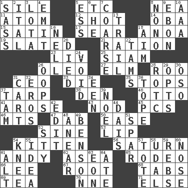 ACROSS 1. Drop; flow; fall 5. And so on (abbr.) 8. Teachers' org. 11. Smallest unit of an element 12. Guess 14. Chief or king in Benin or Nigeria 15. Smooth fabric 17. Scorch 18. Small Philippine buffalo 19. Scheduled 21. Food allowance for one day 23. 54 in ancient Rome 25. Thailand, formerly 26. Butter sub 27. Shade tree 28. Friend of Pooh 31. Corporate head (abbr.) 33. Pass on 35. Obstructs or blocks passage 37. Canvas cover 38. Lair 40. Von Bismarck 41. Came up 43. Allow head to fall sleepily 45. Personal Computers (abbr.) 46. Mountains (abbr.) 47. Apply (a substance) by light strokes 50. Comfort 52. Trig term 53. Mouth edge 54. Baby cat 56. Titan orbits this 61. Actor Griffith 62. At sea 65. Cowboy competition 66. Area sheltered from the wind 67. Carrot, for example 68. Bar bills 69. Afternoon social gathering 70. Compass dir. 71. Otherwise DOWN 1. Backtalk 2. Slanted text style (abbr.) 3. Globular water bottle used in Asia 4. Give off 5. Double-curved letter 6. Definite Article 7. Unrefined 8. Words to Nanette 9. Inky black, to poets 10. Auto club (abbr.) 13. Hang back 16. 1994 drama film starring Jodie Foster 18. Direct toward a target or goal 20. Passed on 22. Scottish caps 24. Null 26. I made a mistake 28. College mil. group 29. Elects 30. Bear (Spanish) 31. Heavy open wagon 32. Greek god of love 34. Car or cant ending 36. Drink excessively 37. Scottish cap 39. Christmas carol 42. Prepare for publication 44. Raised platform 48. Approach 49. Gillaume's butler role 51. Coast Guard woman 52. Filthy place 54. Leg joint 55. The content of cognition 57. Lug 58. Freehold land 59. Confederate soldiers (slang) 60. Characteristic smell of wine 61. The first octave above the treble staff 63. Period of immesurable duration 64. Had dinner