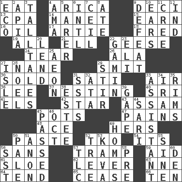 ACROSS 1. Consume 4. N. Chile seaport 9. Tenth: prefix 13. Tax preparer (abbr.) 14. French painter Edouard 15. Merit 16. Petroleum 17. Nick name for Arthur 18. Flintstone 19. Everything 21. Pipe bend 22. Honkers 24. Separate forcefully 26. Insect wing 27. Empty; void 29. Stricken, poetically 30. Twentieth part of a lira 31. Suttee (variant) 33. Atmosphere 36. Area sheltered from the wind 37. Nestling 40. _ Lanka 41. Raised railways 42. Play the lead 43. Indian state 45. Plant holders 47. Aches 48. Adept person 49. Possessive pronoun 50. Thick mixture 52. Ring climax 54. It is 56. Without 57. _____ steamer (cargo ship) 59. Assist 61. _ gin 62. Prying instrument 63. Compass dir. 64. Look after 65. Desist 66. Nine, plus one DOWN 1. Environmental prefix 2. Capital of Western Samoa 3. Baron Munchausen's specialties 4. Nanny (var.) 5. Less widely known 6. International (abbr.) 7. To provide with a ceiling 8. Had dinner 9. Outscore 10. Hearing organs 11. Algonquian 12. Working for oneself (abbr.) 20. Grant temporary use of 22. Homeless child 23. Biblical high priest 25. A really long time 27. Capri or Wight 28. Christmas carol 29. Commotion 31. Fast planes 32. _ moment's notice (2 wds.) 33. Helper 34. SW Asia republic 35. Basketball hoops 38. First name in cosmetics 39. Yawn 44. Indian skirt 45. Went by 46. Sep. follower 49. Dwellings 50. Light colored 51. Soon (poet.) 52. Woody plant 53. Polynesian shrub of the pepper family 55. Trig term 56. Fast jet (abbr.) 57. Affectionate concern, for short 58. Before (prefix) 60. Lair