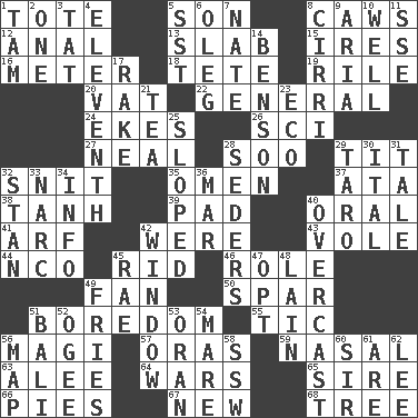 ACROSS 1. Carryall 5. Male child 8. Crow sounds 12. Of or related to the anus 13. Broad, flat, thick piece 15. Angers 16. Distance measurement 18. Wig 19. Cause heat under the collar 20. Large container 22. Commissioned military rank 24. Supplements with great effort 26. _-fi 27. Be tempered by heat 28. "Barney Miller" actor Jack 29. Teat (slang) 32. In a ____ (agitated or irritated) 35. Presage 37. _ moment's notice (2 wds.) 38. Hyperbolic tangent 39. Writing tablet 40. Spoken 41. Sandy's bark 42. Past tense of be (plural) 43. Grand slam 44. Non-commissioned officer (abbr.) 45. To free from 46. Hero or heavy, e.g. 49. Avid follower 50. Practice fight 51. Mood resulting from idleness 55. Nervous spasm 56. Wise men 57. Mouths or openings 59. Rhinal 63. Toward shelter 64. Armed conflicts 65. Title for a man of rank and authority 66. Sliced desserts 67. ___ Haven, CT 68. Woody plant DOWN 1. Scottish cap 2. Single 3. Make lace 4. Veterans Day date 5. Fast jet (abbr.) 6. Cassini of fashion 7. Nathan's nickname 8. High-altitude cloud 9. Operatic vocal solo 10. Not ill 11. Compass dir. 14. Gillaume's butler role 17. Libertine 21. Beverage made from leaves 23. Environmental prefix 25. Had an oblique or slanted direction 28. Spring feasts 29. Edible starchy tuberous root 30. Slanted text style (abbr.) 31. Falsehood 32. Comedian Laurel of Laurel & Hardy 33. Drug cop 34. Information 36. Make imperfect 40. Cloudy 42. Light entry point 45. Actress Charlotte 47. Choose 48. (Had) reclined 49. Strips of potato fried in deep fat 51. Indonesian resort city 52. Double curve, resembling the letter S 53. Northwest Algerian city 54. Female horse 56. Atlas unit 58. Compass dir. 60. Title for a knight 61. "We ___ not amused" (Victoria) 62. Area sheltered from the wind