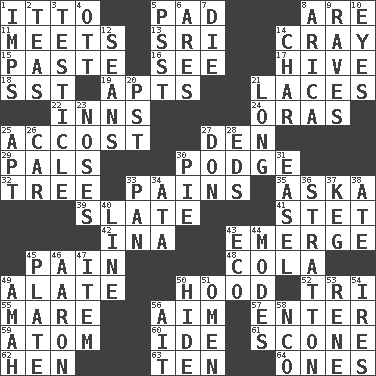 ACROSS 1. "Tell ____ the Marines!" 5. Groovy apt. 8. "We ___ not amused" (Victoria) 11. Confronts 13. _ Lanka 14. Supercomputer manufacturer 15. Thick mixture 16. Observe 17. Hub of activity 18. Fast jet (abbr.) 19. Flats, for short 21. Shoestrings 22. Lodging establishments 24. Mouths or openings 25. Buttonhole 27. Lair 29. Friends 30. Plash 32. Relationship diagram 33. Aches 35. "____ silly question..." 39. Chalkboard 41. Proofreading order 42. _ tizzy (2 wds.) 43. Develop 45. Ache 48. Root beer relative 49. Having winglike extensions 50. Parka part 52. Three (prefix) 55. Female horse 56. Direct toward a target or goal 57. Keyboard key 59. Tiny particle 60. Binary compound 61. Biscuitlike quick bread 62. Layer 63. "___ Little Indians" 64. Singles DOWN 1. Naughty children 2. Afternoon social gatherings 3. A testis 4. Baseball player Mel 5. Inconspicuous attention getter 6. Ancient Greek god of war 7. Expire 8. N. Chile seaport 9. All-night dance parties 10. Sight organs 12. Seines 14. Burn to charcoal 20. Pacific Standard Time (abbr.) 21. Yearn 23. Olfactory organs 25. Fitting 26. Automobile 27. Spanish title 28. Begley and Asner 30. Sliced dessert 31. Artist's stand 33. Baking dish 34. "One Day ___ Time" 36. Ski resort town in Vermont 37. Barrel 38. Had dinner 40. Actor's bit 43. Environmental prefix 44. Methods 45. Food holder 46. Composer Copland 47. Detail 49. Wet nurse 50. Flintstone garb 51. Sign of things to come 53. French philosopher Descartes 54. Angers 56. Small island 58. Non-commissioned officer (abbr.)