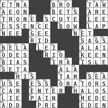ACROSS 1. Inactive volcano in Sicily 5. Sis' sibling 8. The 23rd letter of the Hebrew alphabet 11. A really long time 12. Stakes 14. "We ___ not amused" (Victoria) 15. Marketplace scale 17. Snake scale 18. Area sheltered from the wind 19. Core 21. Arrow shooter 22. Infant locale 23. Born 24. Turn to the right 25. Fish or hair follower 27. To free from 28. Settles 31. Actor Lugosi 35. Luau accessory 37. Jai ____ 38. Lyric poems 39. _ de Janeiro 41. Peachy ____! 42. Prejudice 43. Retirement account (abbr.) 45. Capri or Wight 46. Stalk of a moss capsule 47. According to 49. Part of HMS, perhaps 51. Scottish cap 52. Ocean 55. Purpose 57. Curvy letter 60. Speakers 62. 4-wheeled motor vehicle 63. Keyboard key 65. Radiant circles of light 66. Whopper 67. Ache 68. Ancient Persian 69. Say or write further 70. Before (prefix) 71. Genesis locale DOWN 1. Eroded 2. Laconic 3. Trap for birds or small mammals 4. Singer Murray 5. English channel? 6. Reuben's nickname 7. Von Bismarck 8. Baron Munchausen's specialties 9. Type of rug 10. Shed a tear 13. Stitched 16. Engineer (abbr.) 17. Sowing specialist 20. To provide with a ceiling 26. 1973 Nobel Price Winner (Physics) Leo 29. Highlander 30. Trig term 31. Moves up and down 32. Singer Brickell 33. Tough but pliablecoriaceous 34. Slender Brazilian palm 36. One more than two 40. Speaker 44. Having or resembling wings 48. Housemaid 50. Ooze 52. Having a sole or soles 53. Wear away 54. NE Netherlands city 55. Southern CA. univ. 56. Stated 58. Fastener 59. Agitate 61. Not wild 64. Compass dir.