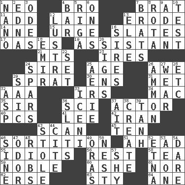 ACROSS 1. Modern: prefix 4. Sis' sibling 7. Naughty child 11. Say or write further 12. (Had) reclined 13. Wear away 14. Compass dir. 15. Goad 16. Chalkboards 17. Fertile tracts in a desert 19. Helper 21. Mountains (abbr.) 23. Angers 24. Beget 25. Personal question 26. Deep reverence 29. Small fatty European fish 30. Followers of ems 31. Was introduced to 32. Auto club (abbr.) 33. Big collection agency 34. Big _ 35. Title for a knight 36. _-fi 37. Thespian 40. Personal Computers (abbr.) 41. Area sheltered from the wind 42. SW Asia republic 43. Glance over 45. "___ Little Indians" 46. Drawing lots 51. Toward the future 55. Foolish or stupid persons 56. Take ten 58. Afternoon social gathering 59. Impressive in appearance 60. American tennis player Robert 61. Not either 62. Celtic language 63. Filthy place 64. One (Scot) DOWN 1. Billionth: prefix 2. Pulitzer Prize-winning author Ferber 3. Lyric poems 4. Soap unit 5. Capital of Latvia 6. Washington bills 7. Naughty children 8. Round or rotation of duties 9. Arabian gulf 10. Trial 12. A period of five years 13. Otherwise 16. Founders of families 18. Independent ruler or chieftain 20. Signals 22. Put into a specified state 24. Practice fights 25. Nest on high 26. ID or VA city 27. Erode 28. And so on (abbr.) 29. Ketch in the Levant 32. Cleo's killer 33. Ancient Celtic tribe of eastern Britain 36. Narrow boards 37. Small island 38. Cause to be 39. Hyperbolic tangent 43. Took without asking 44. Quote 46. Trig term 47. Scent 48. Teases 49. Mouths or openings 50. A home for chicks 52. Inactive volcano in Sicily 53. A really long time 54. Have the gumption 57. Like a shrinking violet