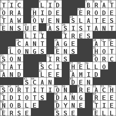 ACROSS 1. Nervous spasm 4. Flaplike covering 7. Naughty child 11. Mouth or opening 12. Flintstone garb 13. Eat (away) 14. The 23rd letter of the Hebrew alphabet 15. Baking chamber 16. Chalkboards 17. Follow as a consequence or result 19. Aide 21. Cards in a Roman deck? 23. Angers 24. Patter 25. Ripen 26. Had dinner 29. Yearns 30. Followers of ems 31. Being at a high temperature 32. Male child 33. Big collection agency 34. The grampus (Milton) 35. Make lace 36. _-fi 37. Phone greeting 40. Added to 41. Area sheltered from the wind 42. Among 43. Examine minutely or intensely 45. Lair 46. Conclusion 51. Arrive at 55. Foolish or stupid persons 56. Mild oath, euphamism for damn 58. To separate or throw off 59. Impressive in appearance 60. Centimeter-gram-second unit of force 61. Make a knot 62. Celtic language 63. Compass dir. 64. Pipe bend DOWN 1. Carryall 2. SW Asia republic 3. Crow sounds 4. 54 in ancient Rome 5. The main thing one is thinking about 6. Cub Scout units 7. Naughty children 8. Roll call or roster of names 9. Arabian gulf 10. Trial 12. Cultivating 13. Otherwise 16. Begets 18. ____ Bator, Mongolia 20. Public displays of written messages 22. It is 24. Continued (abbr.) 25. Nest on high 26. Hold, grip (Informal) 27. "Corrida" creature 28. And so on (abbr.) 29. Grant temporary use of 32. R.R. building 33. Ancient Celtic tribe of eastern Britain 36. Narrow boards 37. Possessed 38. Develop 39. Actor's bit 43. Fur scarf 44. Quote 46. Trig term 47. Scent 48. Chest bones 49. Likelihood 50. Negative votes 52. Johnson of "Laugh-In" 53. To provide with a ceiling 54. Person who is morally reprehensible 57. Compass dir.