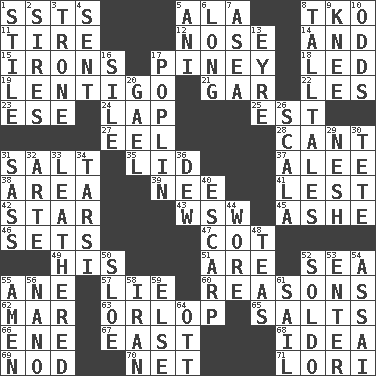 ACROSS 1. Fast planes 5. In the manner of 8. Ring climax 11. Become fatigued 12. Olfactory organ 14. Plus 15. Metal shackles 17. Abounding in pines 18. Directed 19. Small, flat, pigmented spot on the skin 21. Slender fish 22. French article 23. Compass dir. 24. Pet locale 25. Eastern Standard Time (abbr.) 27. Snakelike fish 28. Patter 31. Table seasoning 35. Flaplike covering 37. Toward shelter 38. Length times width 39. Born 41. For fear that 42. Play the lead 43. Compass dir. 45. American tennis player Robert 46. Arranges properly for use 47. Small bed 49. Part of HMS, perhaps 51. "We ___ not amused" (Victoria) 52. Ocean 55. A saturated hydrocarbon 57. Falsehood 60. Thinks logically 62. Impair 63. Lowest deck of a ship 65. Table seasonings 66. Compass dir. 67. Compass direction 68. The content of cognition 69. Lower and raise head in agreement 70. Remaining after all deductions 71. Australian parrot (variant) DOWN 1. Vertical member of a panel or frame 2. Founders of families 3. Marketplace scale 4. Emitted 5. Cuckoo 6. Having great length 7. At sea 8. Baron Munchausen's specialties 9. Leg joint 10. Likelihood 13. Jane of fiction 16. Filth; sediment 17. Cotton for raincoats, e.g. 20. Highlander 26. Any of the three canals of the cochlea 29. Tender 30. False hair 31. Backtalk 32. Johnson of "Laugh-In" 33. Resembling or made to resemble leather 34. Tarsus (plural) 36. Morning condensation 40. Fortification 44. Had on 48. Beverages made from leaves 50. _ gin 52. Twentieth part of a lira 53. Keyboard key 54. Slender Brazilian palm 55. So be it 56. Billionth: prefix 58. SW Asia republic 59. Otherwise 61. Move on water 64. Baseball player Mel